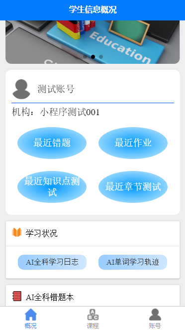 最近錯題,最近作業(yè),最近知識點測試,最近章節(jié)測試,學習狀況,AI全科錯題本等。